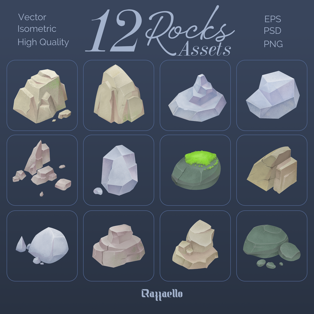 You’ll get 12 high-quality isometric rock PNGs, EPS and PSD files.